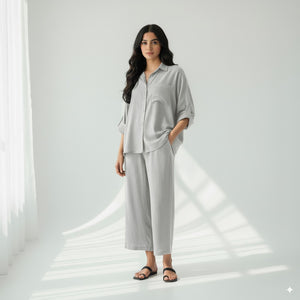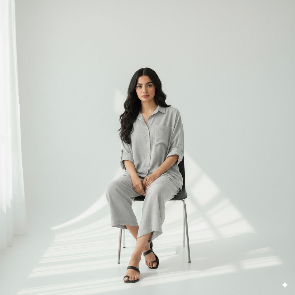 Crafted from soft Chinese georgette, this dress flows with effortless grace in a muted gray hue.